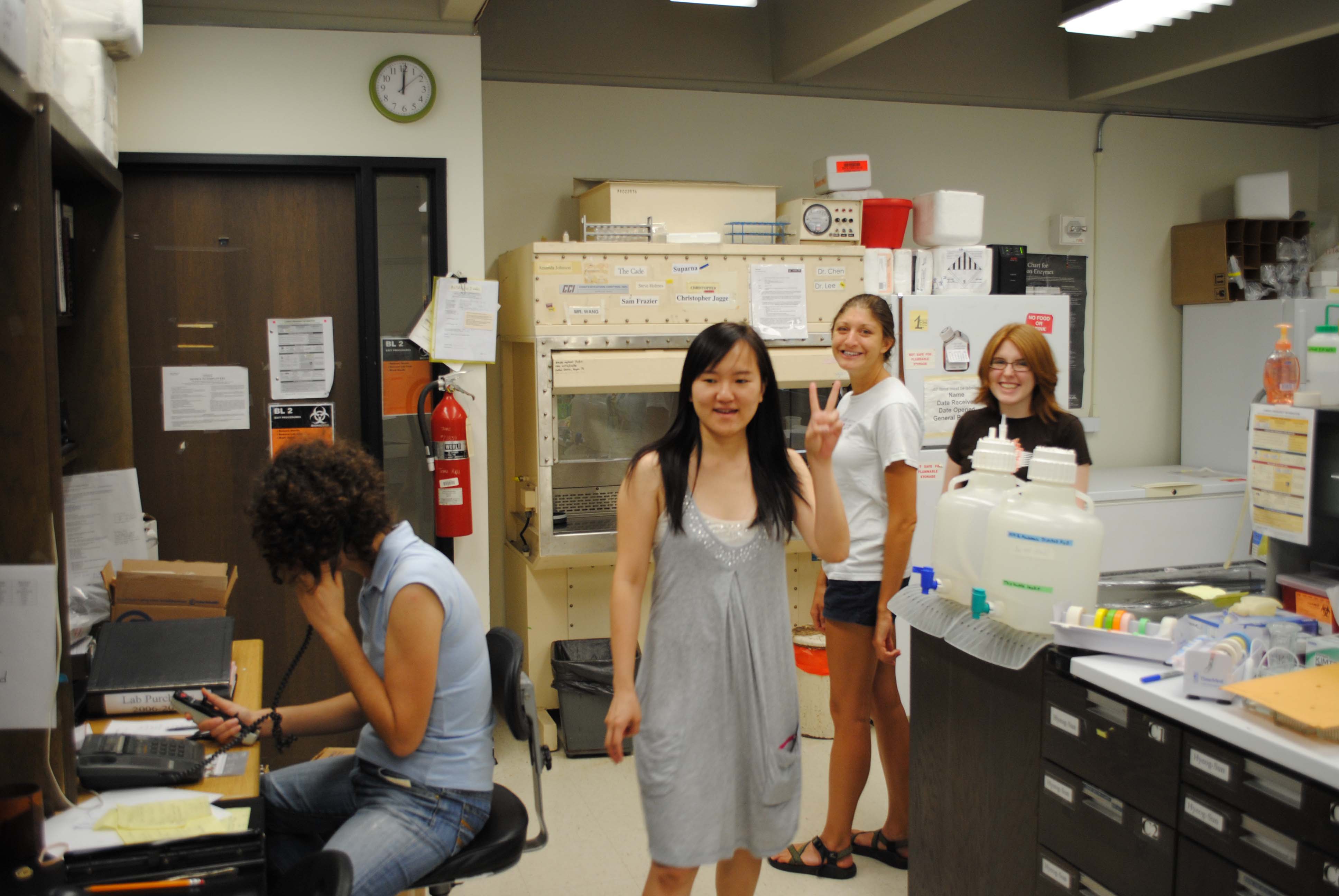 Fun in the lab (past lab members from left to right): Sasha Kay, Hsiao-Ling Lu, Cymon Kersch and Kara Welch.